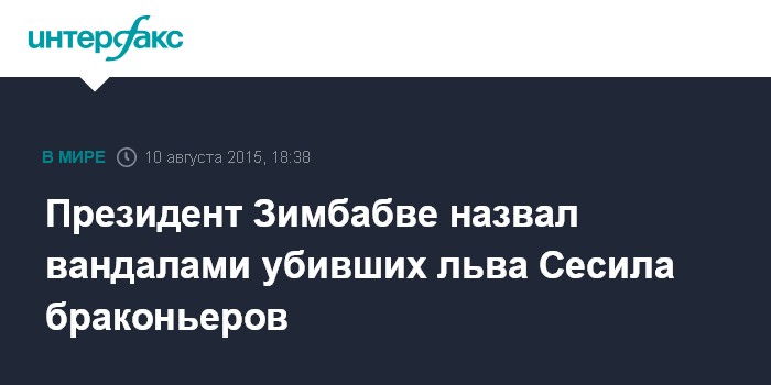 Москва. 10 августа. INTERFAX.RU - Президент Зимбабве Роберт Мугабе осудил "иностранных вандалов" за убийство льва Сесила, являвшегося одним из символов страны, сообщает в понедельник британский телеканал Sky news.