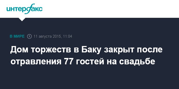 Москва. 11 августа. INTERFAX.RU - Бакинский дом торжеств, в котором на свадьбе отравились около 80 человек, закрыт за несоблюдение норм гигиены, сообщил агентству "Интерфакс" начальник отдела питания Центра гигиены и эпидемиологии Минздрава Азербайджана Имран Абдуллаев.