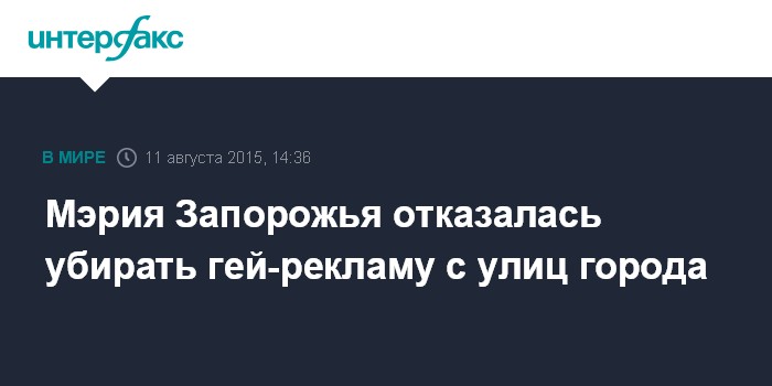 Москва. 11 августа. INTERFAX.RU - Мэрия Запорожья заявила, что не сможет снять щиты с социальной рекламой против дискриминации сексменьшинств.