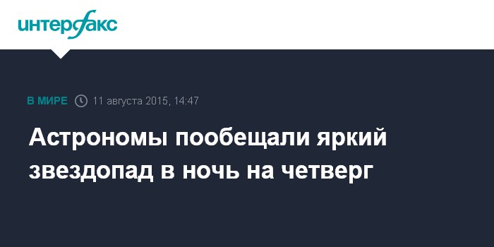Москва. 11 августа. INTERFAX.RU - Яркий звездопад смогут наблюдать жители России в ночь на четверг, 13 августа, сообщила ученый секретарь Пулковской астрономической обсерватории РАН Татьяна Борисевич.