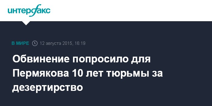 Москва. 12 августа. INTERFAX.RU - Гособвинение по делу о дезертирстве и хищении оружия, по которому проходит рядовой Валерий Пермяков, попросило военный суд приговорить подсудимого к 10 годам лишения свободы.