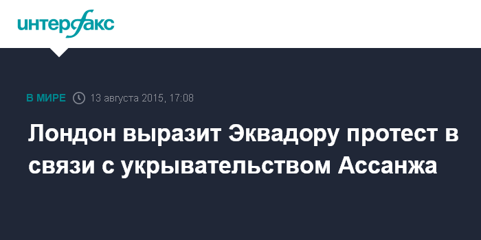 Москва. 13 августа. INTERFAX.RU - Власти Великобритании в четверг сообщили о намерении направить официальный протест Эквадору в связи с предоставлением убежища основателю WikiLeaks Джулиану Ассанжу и воспрепятствованием его экстрадиции в Швецию, сообщают западные СМИ.