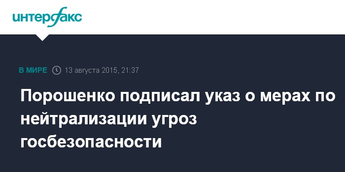 Москва. 13 августа. INTERFAX.RU - Президент Украины Петр Порошенко подписал указ, которым вводит в действие решение Совета национальной безопасности и обороны Украины от 20 июля "О безотлагательных мерах по нейтрализации угроз государственной безопасности" (с грифом "секретно").