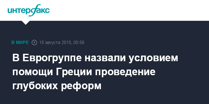 Москва. 15 августа. INTERFAX.RU - Основное политическое условие финансовой помощи Греции - реализация глубоких реформ, заявил глава Еврогруппы Йерун Дейсселблум. Он объявил в пятницу вечером о достижении политического соглашения министров финансов еврозоны по третьей программе финансовой помощи Греции.