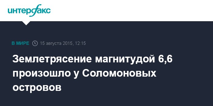 Москва. 15 августа. INTERFAX.RU - В районе Соломоновых островов в Тихом океане произошло землетрясение магнитудой 6,6, сообщает в субботу Геологическая служба США.