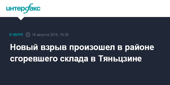 Москва. 16 августа. INTERFAX.RU - Взрыв небольшой мощности произошел в районе склада в китайском Тяньцзине, который сгорел после серии взрывов в среду, сообщили местные СМИ.