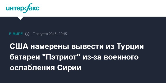 Москва. 17 августа. INTERFAX.RU - Решение США о выводе систем ПВО "Пэтриот" из Турции в октябре этого года принято из-за снижения военного потенциала соседней Сирии, заявил в понедельник представитель Пентагона капитан Джефф Дэвис.