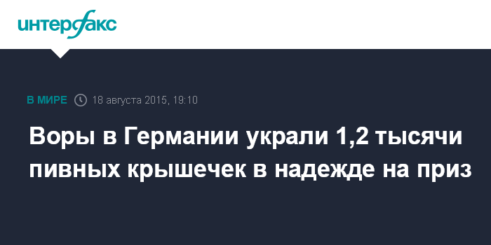 Москва. 18 августа. INTERFAX.RU - Немецкая полиция расследует дело о краже в магазине алкогольной продукции города Мюльхайм-ан-дер-Рур крышек от 1,2 тыс. бутылок с пивом, сообщает во вторник агентство Associated Press.