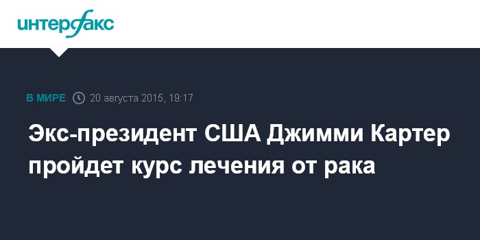Москва. 20 августа. INTERFAX.RU - Бывший президент США 90-летний Джимми Картер заявил на пресс-конференции в Атланте, что начиная с этого четверга он пройдет курс лучевой терапии на мозге для лечения опухолей, сообщает агентство Bloomberg.