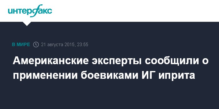 Москва. 21 августа. INTERFAX.RU - Специалисты вооруженных сил США заявили, что боевики экстремистской группировки "Исламское государство" (запрещенной в России) применяли в боевых действиях против курдских ополченцев отравляющий газ иприт, сообщила в пятницу газета The Wall Street Journal.