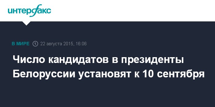 Москва. 22 августа. INTERFAX.RU - Центризбирком Белоруссии заявляет, что точное число кандидатов на пост президента страны будет установлено к 10 сентября.