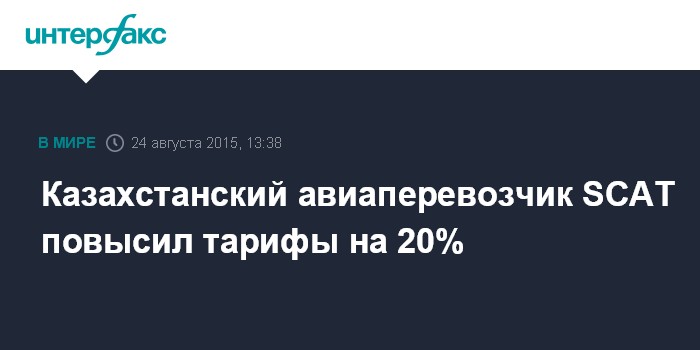 Москва. 24 августа. INTERFAX.RU - Казахстанская авиакомпания SCAT сообщает о вынужденном повышении тарифов на 20% с 25 августа на все международные направления, сообщается на ее сайте.