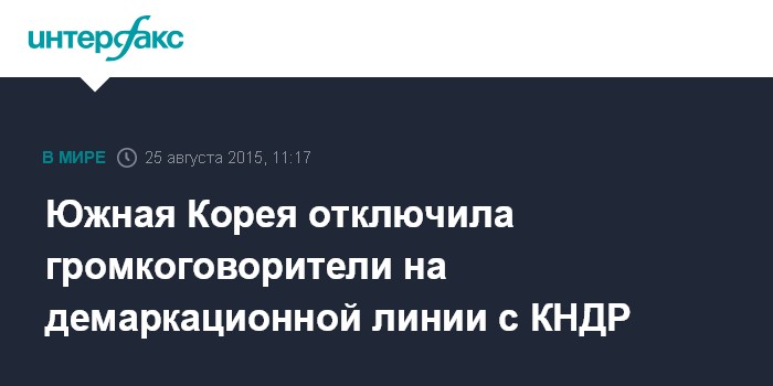 Москва. 25 августа. INTERFAX.RU - Южная Корея во вторник прекратила работу громкоговорителей на демаркационной линии с КНДР вместе с отменой Пхеньяном полувоенного положения, сообщают южнокорейские СМИ со ссылкой на представителя министерства обороны Южной Кореи.