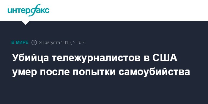 Москва. 26 августа. INTERFAX.RU - Подозреваемый в нападении и убийстве журналистов телестанции WDBJ7 (штат Вирджиния, США) скончался в больнице от раны, полученной при попытке покончить с собой.