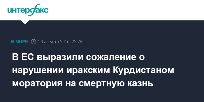 Москва. 26 августа. INTERFAX.RU - Нарушение моратория на смертную казнь - приведение в исполнение высшей меры наказания Фархаду Джафар Махмуду и его двум женам в иракской автономной области Курдистан 12 августа 2015 года - представляет собой шаг назад в обязательствах властей, заявил официальный представитель Европейской внешнеполитической службы (ЕВС).