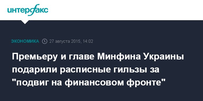 Москва. 27 августа. INTERFAX.RU - Министр внутренних дел Украины Арсен Аваков по случаю достижения Украиной договоренностей о реструктуризации 20% госдолга подарил министру финансов Украины Наталье Яресько декоративно расписанную гильзу от 120-мм снаряда.