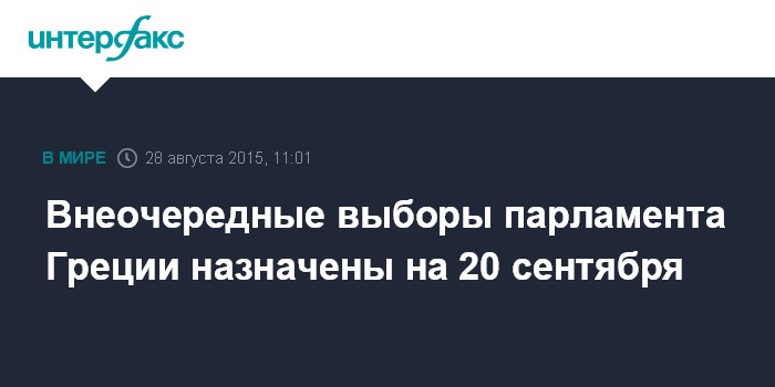 Москва. 28 августа. INTERFAX.RU - Внеочередные парламентские выборы в Греции назначены на 20 сентября, сообщают местные СМИ со ссылкой на источники в канцелярии президента страны.