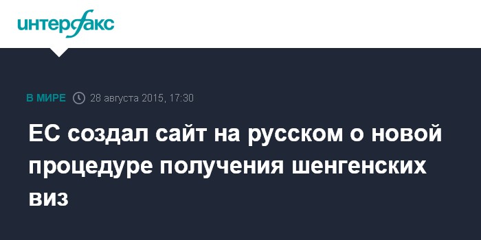 Москва. 28 августа. INTERFAX.RU - Евросоюз запустил специальный русскоязычный сайт, разъясняющий процедуру получения шенгенских виз, которая вступит в силу 14 сентября 2015 года, сообщила журналистам заместитель глава департамента прессы и информации представительства ЕС в России Александра Набокина.