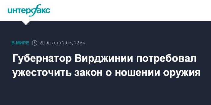 Москва. 28 августа. INTERFAX.RU - Глава административной власти американского штата Вирджиния Терри Маколифф в пятницу заявил о необходимости ужесточить законы об использовании огнестрельного оружия после убийства двух тележурналистов.