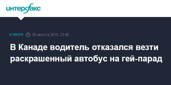 Москва. 28 августа. INTERFAX.RU - В Канаде водитель автопарка Calgary Transit заявил, что бросит работу, если руководство заставит его везти автобус на Calgary Pride Festival, раскрашенный в соответствующие цвета. Об этом пишет канадская National Post.