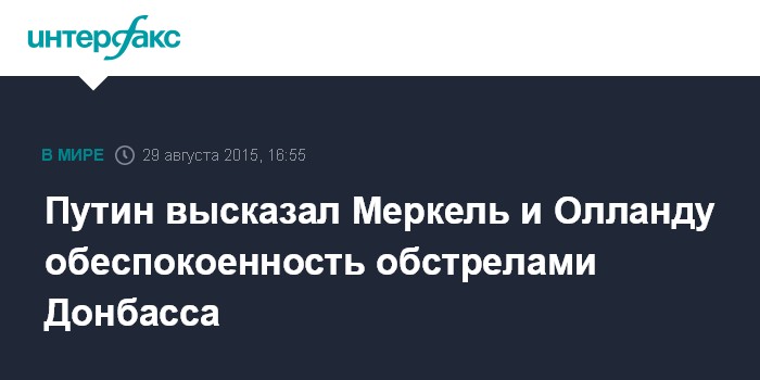 Москва. 29 августа. INTERFAX.RU - Президент России Владимир Путин обеспокоен продолжающимися обстрелами украинскими силовиками населенных пунктов Донбасса, наращиванием вооруженных сил Украины вдоль разграничительной линии.