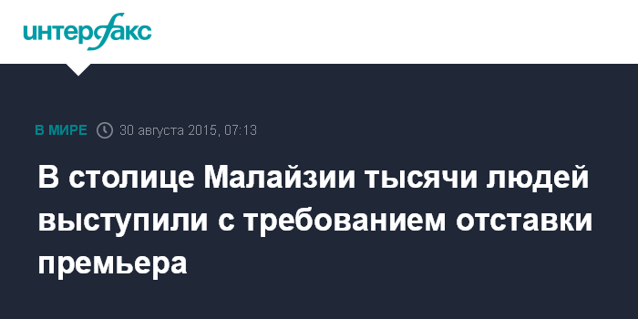 Москва. 30 августа. INTERFAX.RU - Тысячи людей собрались в воскресенье в центре столицы Малайзии Куала-Лумпуре, требуя отставки премьер-министра страны Наджиба Разака.