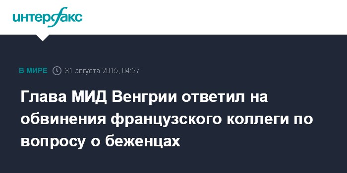 Москва. 31 августа. INTERFAX.RU - Безосновательными назвал министр иностранных дел Венгрии Петер Сийярто обвинения со стороны главы МИД Франции Лорана Фабиуса в том, что венгерские власти закрывают свои границы, чтобы не допустить притока беженцев из Северной Африки и Ближнего Востока.