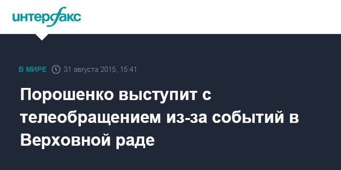 Москва. 31 августа. INTERFAX.RU - Президент Украины Петр Порошенко в понедельник обратится к украинскому народу с обращением в связи с событиями в Верховной раде и у ее стен.