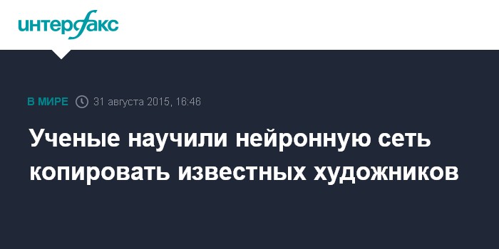 Москва. 31 августа. INTERFAX.RU - Коллектив ученых из Германии разработал искусственную нейронную сеть, которая позволяет "синтезировать" изображение из двух независимых источников: одно из них дает только содержание, другое - только стиль и таким образом им удалось перерисовать фотографии в стиле известных художников, сообщает N+1 со ссылкой на arXiv.org.