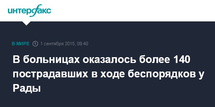 Москва. 1 сентября. INTERFAX.RU - По состоянию на утро вторника в госпиталях и больницах Киева находится 141 пострадавший в результате беспорядков у здания Верховной рады 31 августа. Десять из них - в тяжелом состоянии, сообщили "Интерфаксу" в пресс-службе ГУ МВД Украины в Киеве.
