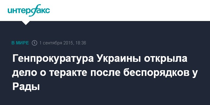 Москва. 1 сентября. INTERFAX.RU - Генеральный прокурор Украины Виктор Шокин сообщил, что по событиям, произошедшим 31 августа возле здания Верховной рады Украины, открыто дело по статье теракт.