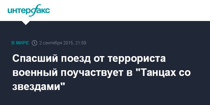 Москва. 2 сентября. INTERFAX.RU - Военнослужащий США Алек Скарлатос, наряду с другими тремя пассажирами обезвредивший мужчину в поезде Амстердам-Париж, приглашен на американскую телепередачу Dancing With The Stars, говорится твиттере программы.