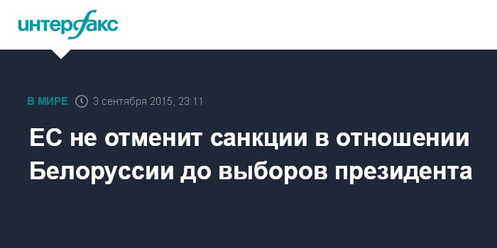 Москва. 3 сентября. INTERFAX.RU - Евросоюз не намерен пересматривать санкции в отношении Белоруссии до проведения выборов президента, которые пройдут 11 октября.