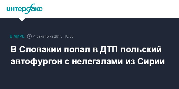 Москва. 4 сентября. INTERFAX.RU - В автофургоне с польскими номерами, который столкнулся с легковым автомобилем близ словацкого города Жилина, находились 23 нелегала из Сирии, сообщил польский телеканал ТВН24 со ссылкой на представителя словацкой полиции Мартина Валдла.