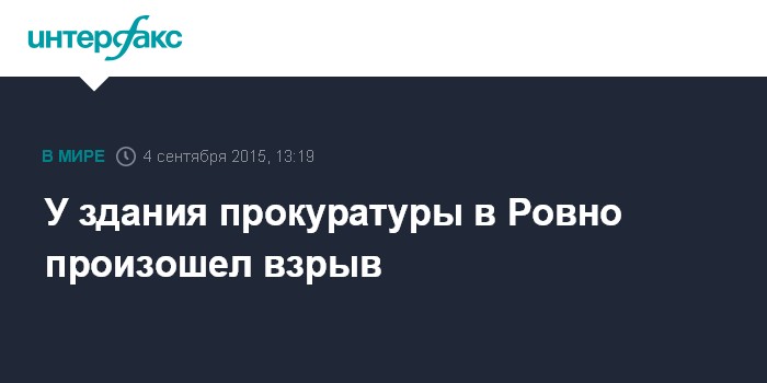 Москва. 4 сентября. INTERFAX.RU -В Ровно перед входом в трехэтажное здание областной прокуратуры произошел взрыв, в результате чего повреждены окна и двери здания, сообщили в пресс-службе УМВД Украины в Ровенской области.