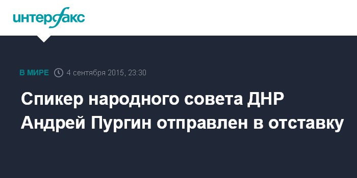 Москва. 4 сентября. INTERFAX.RU - В пресс-службе парламента самопровозглашенной Донецкой народной республики подтвердили отставку спикера Андрея Пургина.