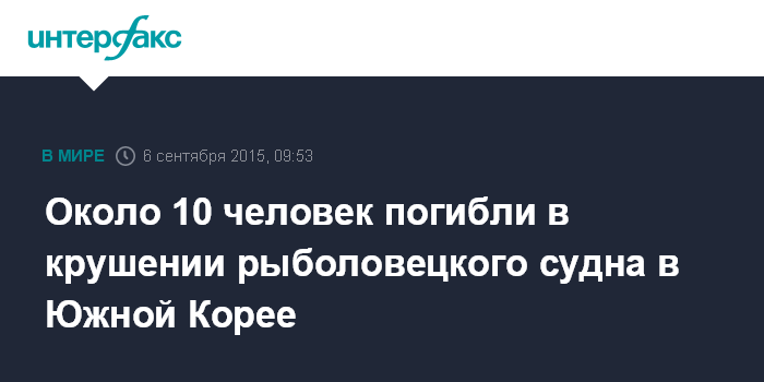 Москва. 6 сентября. INTERFAX.RU - Не менее девяти человек погибли в результате крушения рыболовецкого судна у берегов Южной Кореи, передает в воскресенье агентство Associated Press.