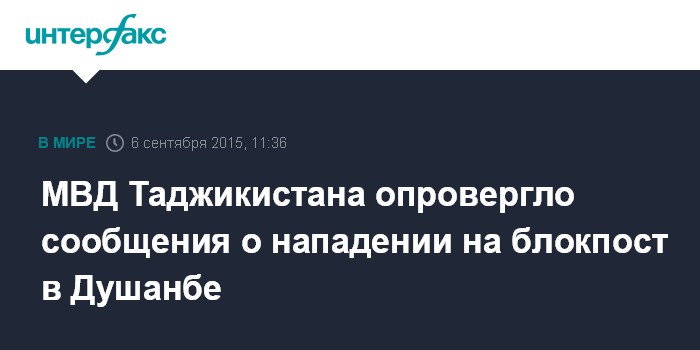 Москва. 6 сентября. INTERFAX.RU - Пресс-центр МВД Таджикистана в воскресенье официально опроверг данные о совершенном вечером 5 сентября нападении на блокпост на выезде из Душанбе, в ходе которого, по данным источников, погиб милиционер.