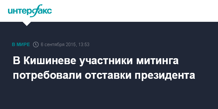 Москва. 6 сентября. INTERFAX.RU - Участники акции протеста в Кишиневе требуют отставки президента и проведения досрочных парламентских выборов не позднее марта 2016 года. Это - лишь часть требований, содержащихся в резолюции многотысячного митинга, который проходит в центре молдавской столицы.
