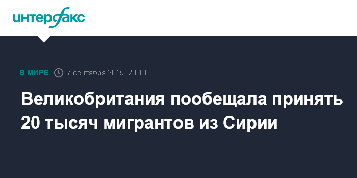 Москва. 7 сентября. INTERFAX.RU - Великобритания в ближайшие пять лет примет 20 тысяч мигрантов из Сирии, заявил членам парламента глава правительства страны Дэвид Кэмерон, чьи слова приводит "Би-би-си".