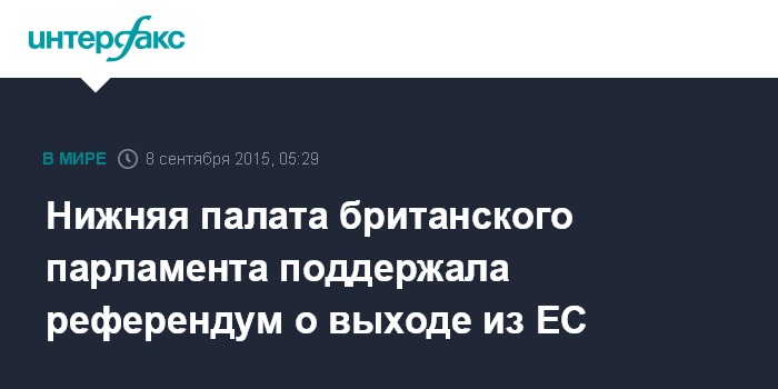Москва. 8 сентября. INTERFAX.RU - Палата общин парламента Великобритании путем голосования одобрила предложение правительства о проведении референдума о членстве страны в ЕС, сообщают СМИ.