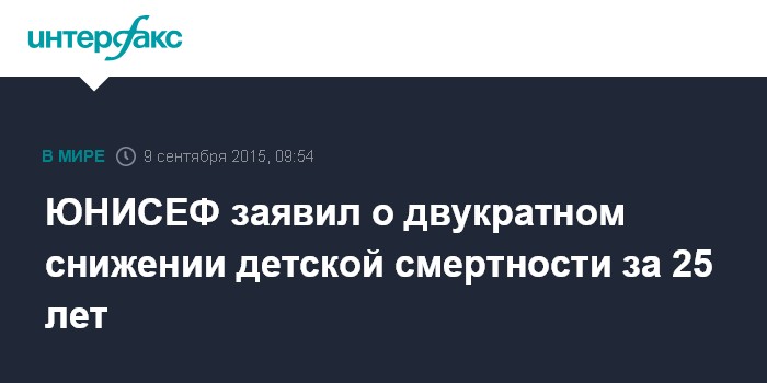 Москва. 9 сентября. INTERFAX.RU - Уровень смертности детей в возрасте до пяти лет снизился примерно на половину с 1990 года, говорится в исследовании, проведенном Детским фондом ООН (ЮНИСЕФ).