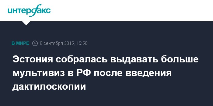 Москва. 9 сентября. INTERFAX.RU - Посольство Эстонии планирует выдавать больше длительных мультивиз россиянам после введения обязательной процедуры дактилоскопии, сообщила "Интерфаксу" пресс-секретарь Российского союза туриндустрии (РСТ) Ирина Тюрина со ссылкой на консульский отдел.