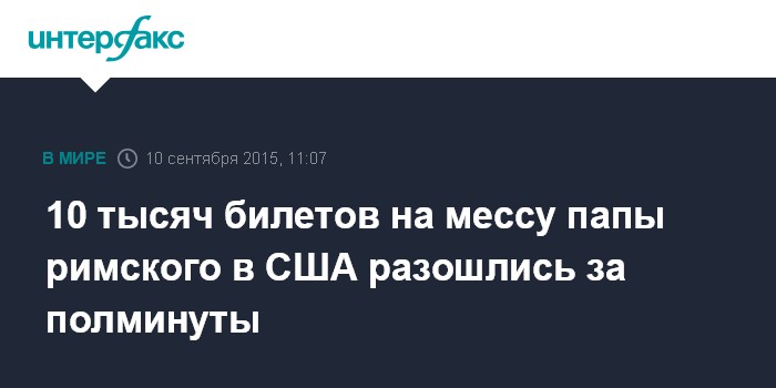 Москва. 10 сентября. INTERFAX.RU - Не менее 10 тысяч билетов на мессу папы римского Франциска в Филадельфии (США) были розданы за 30 секунд, сообщают в четверг американские СМИ.