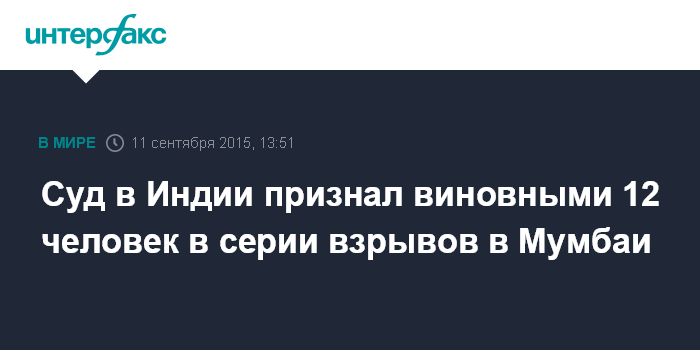 Москва. 11 сентября. INTERFAX.RU - Индийский суд вынес обвинительный приговор в отношении 12 человек, подозреваемых в серии взрывов на железнодорожном вокзале в индийском городе Мумбаи в 2006 году, сообщает в пятницу веб-сайт ливанской газеты The Daily Star.