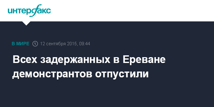 Москва. 12 сентября. INTERFAX.RU - Задержанные утром в субботу в центре Еревана участники акции протеста против повышения тарифов на электроэнергию отпущены на свободу, заявил "Интерфаксу" пресс-секретарь полиции Армении Ашот Агаронян.
