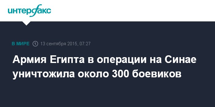Москва. 13 сентября. INTERFAX.RU - Более 300 боевиков, лояльных группировке "Исламское государство" (ИГ), были уничтожены армией Египта с начала операции на Синайском полуострове, сообщили журналистам египетские военные источники.