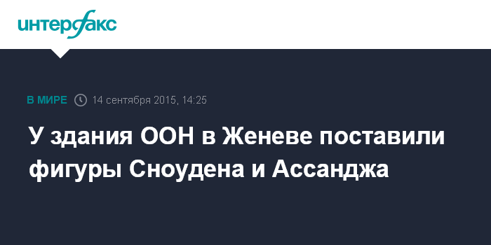 Москва. 14 сентября. INTERFAX.RU - Бронзовые фигуры Джулиана Ассанджа, Челси Мэннинг и Эдварда Сноудена, восседающие на стульях, установлены на площади перед зданием представительства ООН в Женеве.