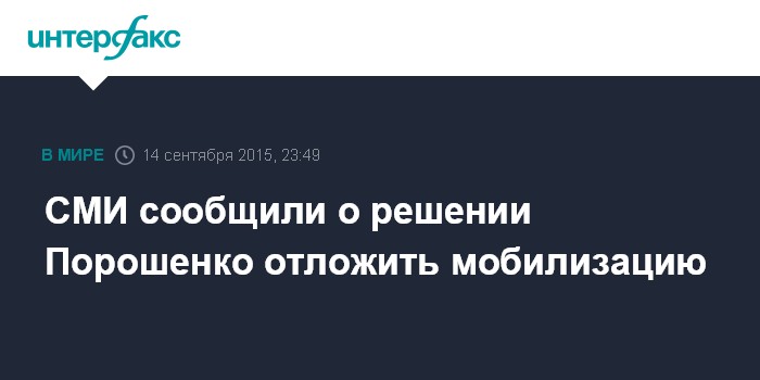 Москва. 14 сентября. INTERFAX.RU - Президент Украины Петр Порошенко принял решение отложить проведение дальнейшей мобилизации, об этом он заявил в своем вступительном слове перед встречей с представителями фракций коалиции в понедельник, сообщило интернет-издание "Украинская правда".