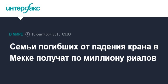 Москва. 16 сентября. INTERFAX.RU - Король Саудовской Аравии Салман ибн-Абдулазиз объявил, что семьи погибших в результате падения крана в пятницу на мечеть Аль-Харам в Мекке получат по одному миллиону саудовских риалов (около 267 тыс. долларов США) в качестве компенсации. Как отмечает портал Albawaba, пострадавшие получат по 500 тыс. риалов.